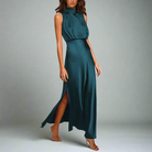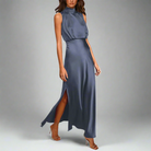 Zeitlose Raffinesse: Die schlanke, fließende Silhouette bietet einen klassischen und zugleich zeitgemäßen Look, ergänzt durch das Neckholder-Design, ideal für besondere Anlässe.
