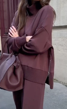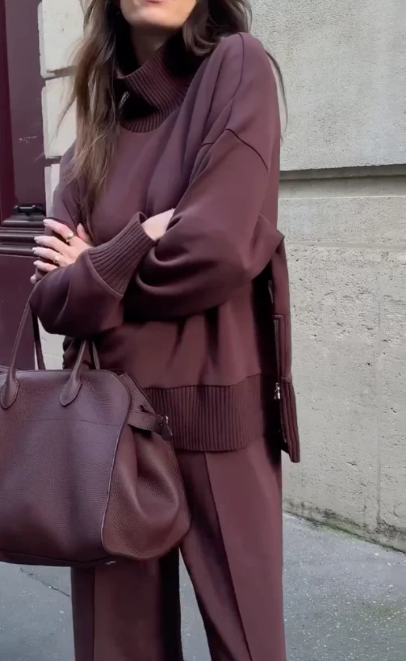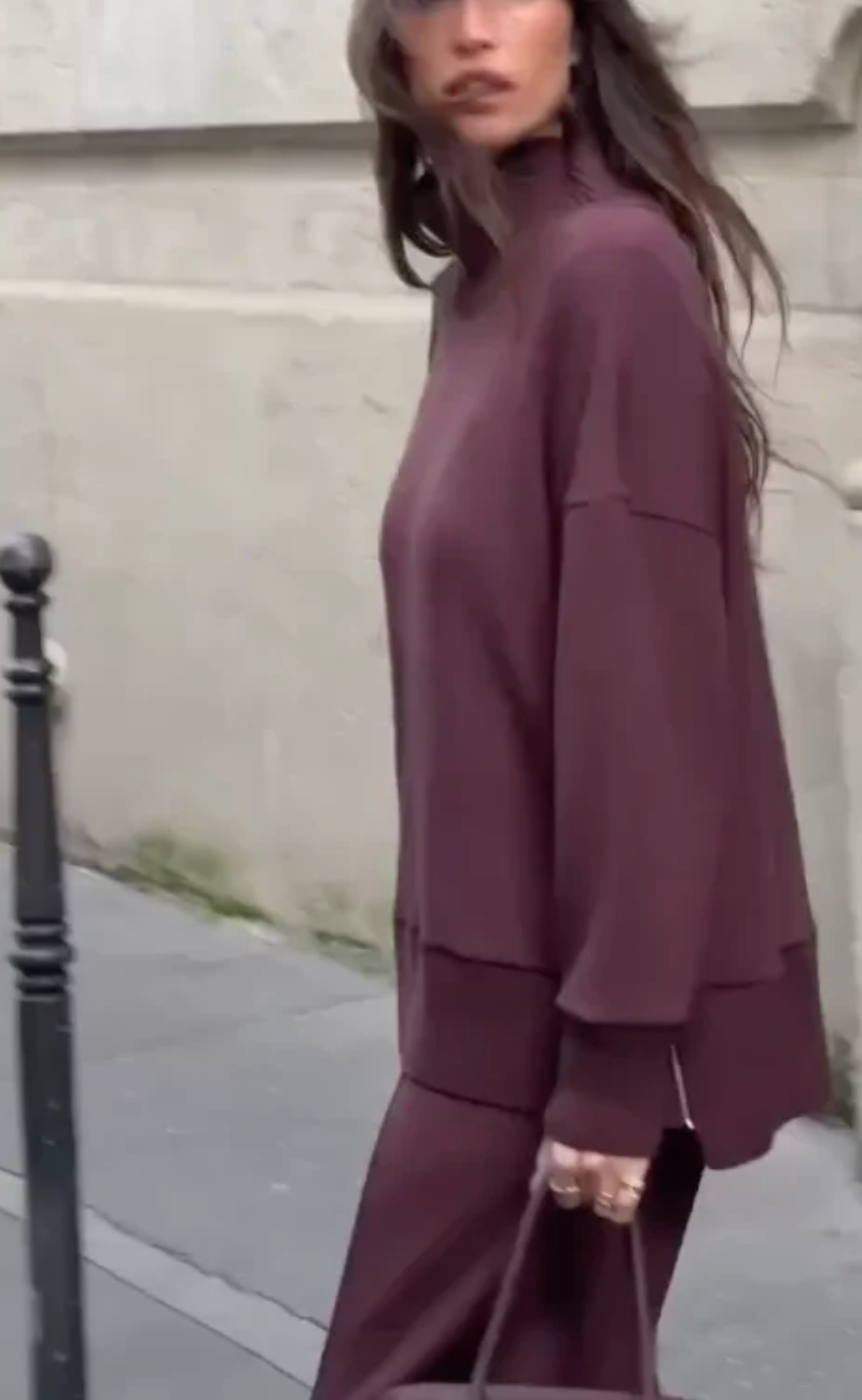- Schmeichelhaft für alle Formen: Der Oversized-Pullover und die Hose mit weitem Bein sind so konzipiert, dass sie schön drapiert werden können, ohne an Stil einzubüßen.